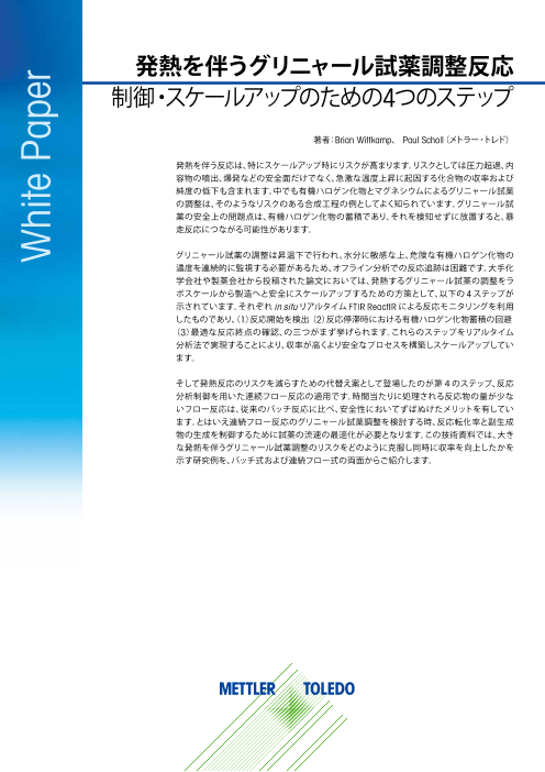 発熱反応は、特にスケールアップ時にリスクを伴います。化学/製薬業界のトップ企業が報告した研究内容から、次の4つの主要なステップによって、ベンチスケールから実機製造まで、発熱を伴うグリニャール反応を安全にスケールアップできることがわかりました。 この...
