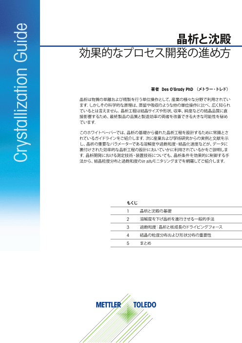 晶析は、製品の分離と精製に使用される一般的な単位操作です。しかし、晶析は蒸留や吸収などのその他の単位操作と比較すると、化学的な基礎について一般的にはあまり知られていません。晶析化の手順は、結晶のサイズ、形状、収率、純度などの製品の属性に直接影響があり、最...