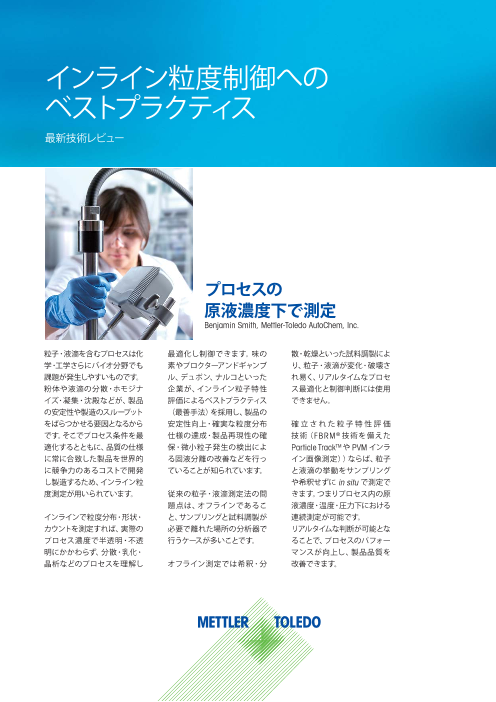 本ホワイトペーパー、『インライン粒子サイズ特性評価のベストプラクティス』 は、科学者およびエンジニアが粒子サイズおよび個数の計量をインラインで実施することにより、プロセスの理解、製品の品質、プロセスのパフォーマンスを改善する方法を説明します。インライン技...