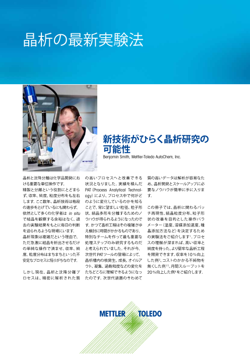 晶析と沈降分離は化学品開発における重要な単位操作です。精製と分離という役割にとどまらず、収率、純度、粒度分布をも左右します。ここ数年、晶析技術は格段の進歩をとげているにも関わらず、依然として多くの化学者はin situで結晶を観察する余裕はなく、過去の実...