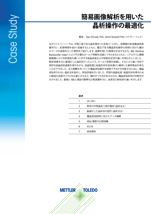 当ホワイトペーパーでは、中間工程である晶析操作(化合物Y )に対し、短期間の新装置適用実験を行い、処理時間を60% 短縮するとともに、難点である種晶添加操作の排除に向けた裏付けデータの採取を行った事例をご紹介します。画像を用いた簡便な手法すなわち、RBI...