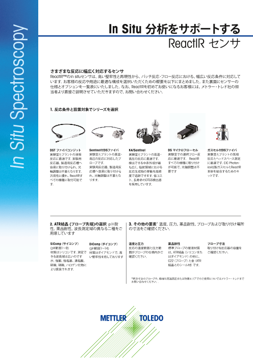 さまざまな反応に幅広く対応するセンサ ReactIR™のin situセンサは、高い堅牢性と再現性から、バッチ反応・フロー反応における、幅広い反応条件に対応しています。 お客様の反応や用途に最適な構成を選択いただくための概要をまとめました。また、セン...