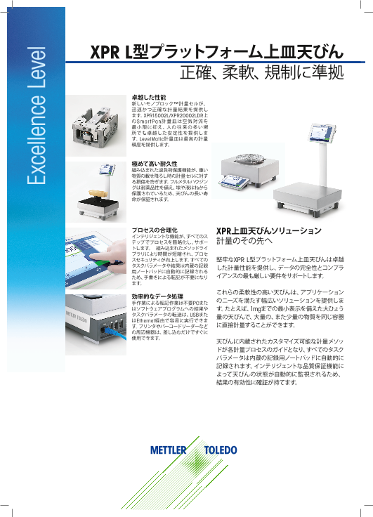 XPR上皿天びんソリューション 計量のその先へ 堅牢なXPR L型プラットフォーム上皿天びんは卓越した計量性能を提供し、データの完全性とコンプライアンスの最も厳しい要件をサポートします。 これらの柔軟性の高い天びんは、アプリケーションの...