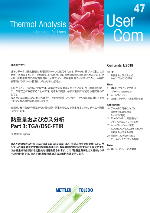 メトラートレドでは、熱分析に関わる技術者の方のための 技術雑誌UserComを年2回発行しています。 この情報誌では、熱分析のヒントとコツ、さまざまな業界での応用例 新技術や製品に関するニュース、地域イベントの開催日 トレーニングコースの案内...