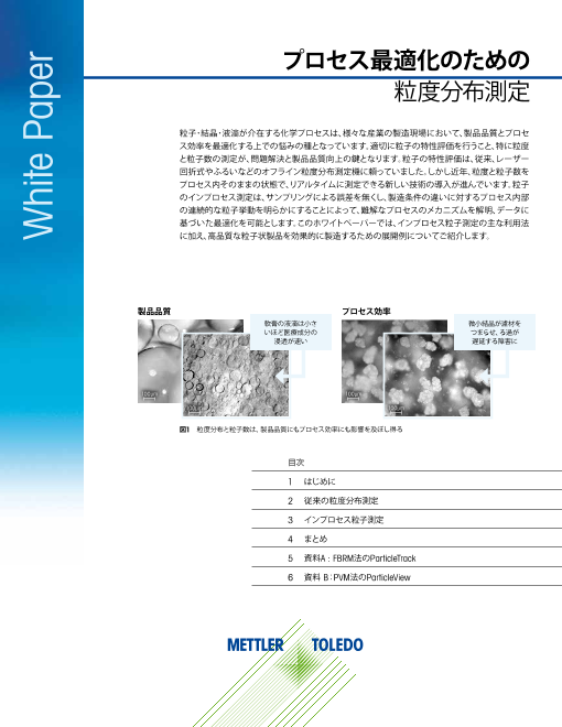 このホワイトペーパーでは、粒子サイズ分析のアプローチの中から最も一般的なものをいくつかご紹介し、高品質の粒子製品を効率的に生産するための導入方法についてもご説明します。 オフライン式の粒度分布計とインラインの粒子測定装置を組み合わせることで、プロセスの最...