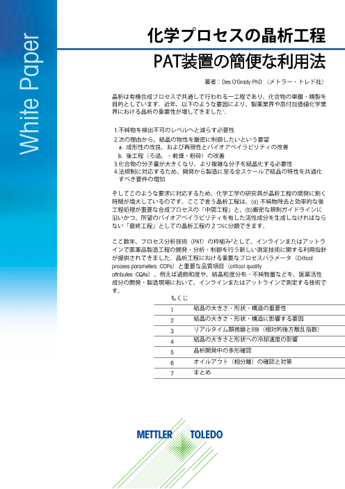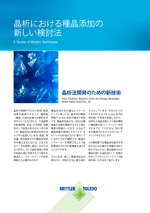 このホワイトペーパー(日本語版):晶析における種晶添加の新しい検討法は、種晶添加条件を決定するための優れた実験手法をご紹介するとともに、種晶添加プロトコルを導入する際に考慮すべきパラメータについて詳述します。 本技術資料は、晶析挙動を最適化する上で...