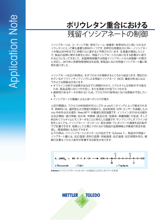 イソシアネートは、コーティング材、発泡フォーム、接着剤、エラストマー、絶縁体の基となるポリウレタンにとって最も重要な原料の一つです。生産量の増加に従って、製品品質の管理と有害な残留イソシアネートが人体に与える影響の二点による懸念も大きくなっています。...