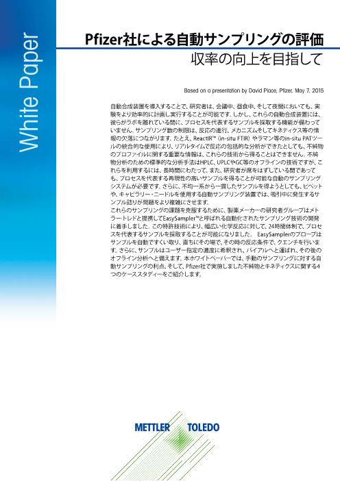 このケーススタディは、有機合成の試薬添加の際に、pHと温度の自動制御により不純物の生成を防ぐことについて説明しています。 有機合成でのプロセス温度やpH制御、添加速度や攪拌速度などの重要なプロセスパラメータを厳密に制御する事で、これらの変動が原因で...