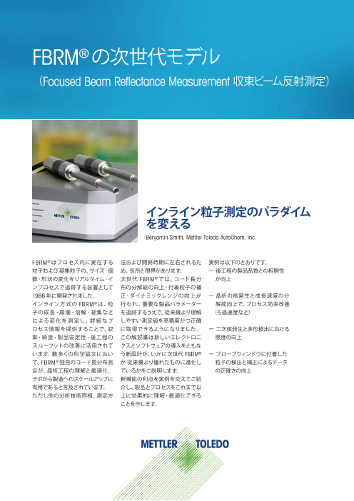 FBRM® はプロセス内に実在する粒子および凝集粒子の、サイズ・個数・形状の変化をリアルタイム・インプロセスで追跡する装置として1986 年に開発されました。インライン方式のFBRM® は、粒子の成長・崩壊・溶解・凝集などによる変化を測定し、詳細なプロセ...