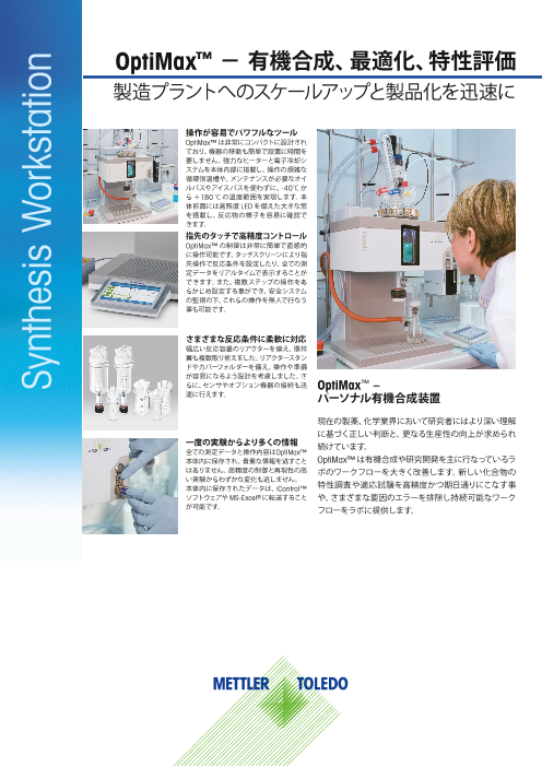 OptiMax™ – パーソナル有機合成装置 現在の製薬、化学業界において研究者にはより深い理解に基づく正しい判断と、更なる生産性の向上が求められ 続けています。 OptiMax™は有機合成や研究開発を主に行なっているラボのワークフローを大きく改善...