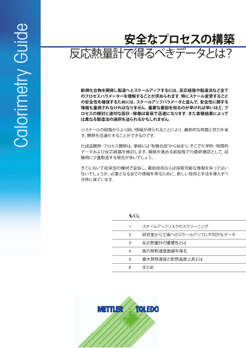 当ガイドを通じて、正しい化学プロセスの理解そしてスケールアップの情報が得られます。 反応熱量計を用いて化学反応をラボから製造プロセスに安全にスケールアップする方法を決定し、反応熱と物性変化や撹拌の問題を特定できます。 当ガイドでは、科学者や化学エ...