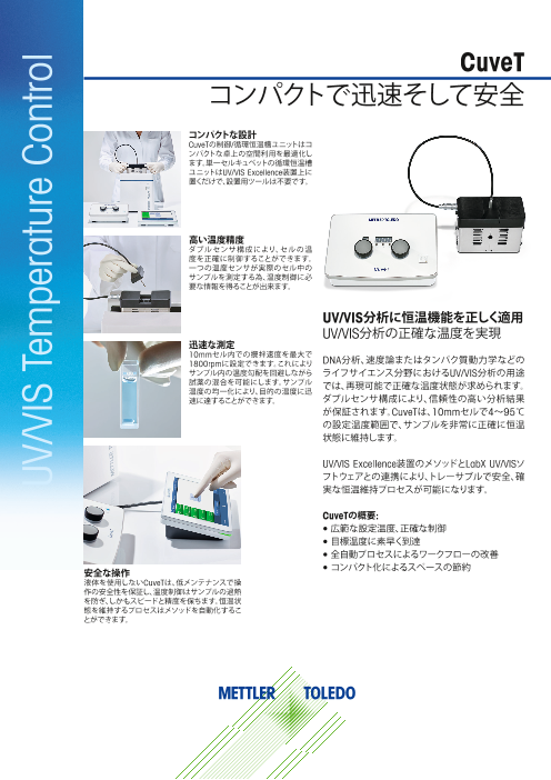 DNA分析、速度論またはタンパク質動力学などのライフサイエンス分野におけるUV/VIS分析の用途では、再現可能で正確な温度状態が求められます。ダブルセンサ構成により、信頼性の高い分析結果が保証されます。CuveTは、10mmセルで4~95℃の設定温度範囲...