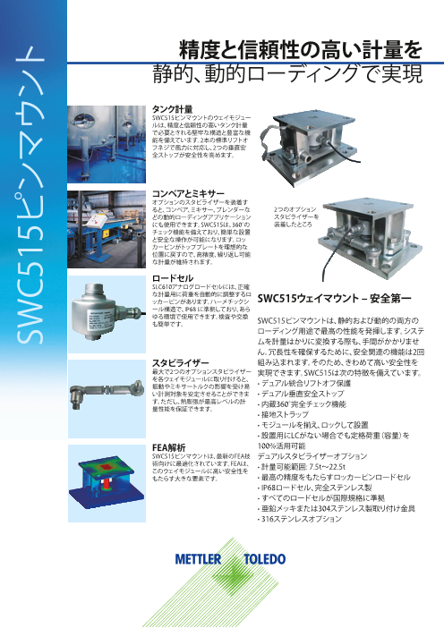 堅牢で設置が容易なPinMount(tm)計量モジュール。ダミーセル不要で設置が出来るため、設置が容易です。CalFree(tm)を使用することで分銅を使用せず校正が可能です。水平方向に360度と浮き上がり防止やダウンストップ機能により、ひとつのタイプで...