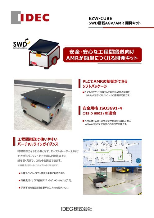 SWD Build KITはAGV/AMRに必要な機能(安全+駆動+制御)をユニット化しており、お客様で簡単にシステム構築が可能です。 PLCでAGV/AMRの制御が可能ですので、使い慣れたPLCを軸に周辺設備やAMRトップモジュールと容易に連携できま...