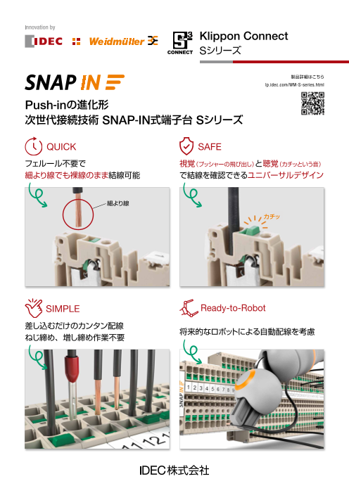 「その問題に、Push-in!」 こんなお悩みはありませんか? ■設計現場で・・・ 「海外に輸出する制御盤。現地での配線を容易にしたい」 ⇒IDECのPush-in式Aシリーズなら、 ねじレスで増し締め不要。出荷時や設置時の作業を簡...