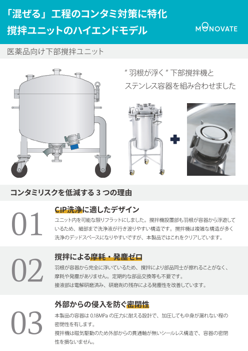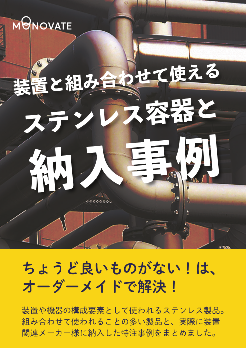 "こんな仕様、実現できる?" 初めてのご相談でも安心していただける、 事例と加工オプションをまとめたカタログをご用意しました。 ステンレス容器・撹拌装置メーカーMONOVATE(モノベート)が手がけた 液体撹拌や粉体投入に関する提案例...