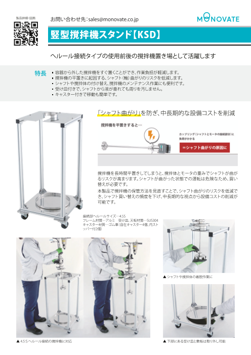 へルール接続タイプの撹拌機を置けるスタンド。 使用前後の撹拌機置き場として便利です。 ◯容器から外した撹拌機をすぐ置くことができるので、作業負担を軽減します。キャスター付きで移動も簡単です。 ◯受け皿付きで、シャフトから液が垂れても周りを汚し...