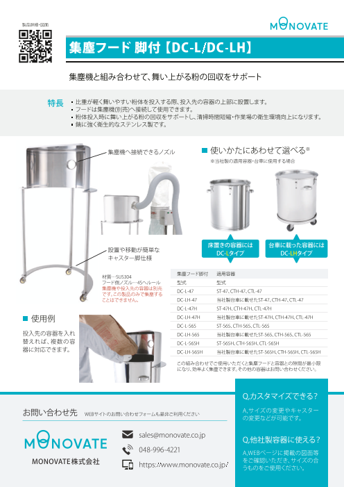 ○比重が軽く舞いやすい粉体を投入する際、投入先の容器の上部に設置します。 ○粉体投入後の清掃時間短縮・作業場の衛生環境向上になります。 ○大きなフードで効率よく集塵できます。フードは集塵機(別売)へ接続して使用できます。 ○投入先の容器を入れ替えれ...