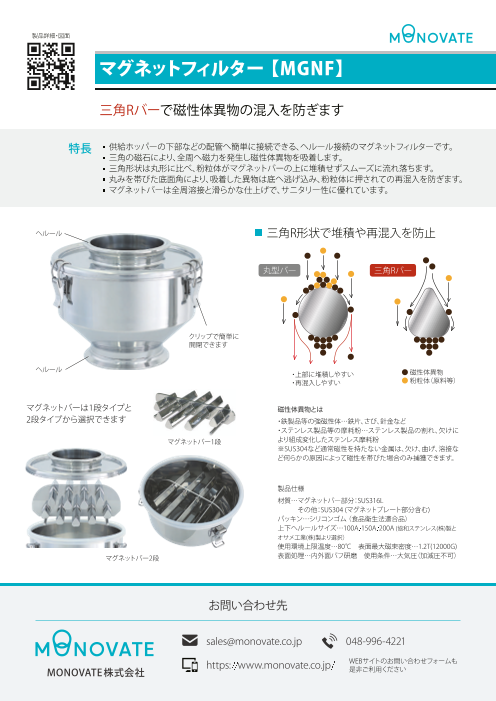 ○供給ホッパーの下部などの配管へ簡単に接続できる、ヘルール接続のマグネットフィルターです。 ○三角の磁石により、全周へ磁力を発生し磁性体異物を吸着します。 ○三角形状は丸形に比べ、粉粒体がマグネットバーの上に堆積せずスムーズに流れ落ちます。 ○丸み...