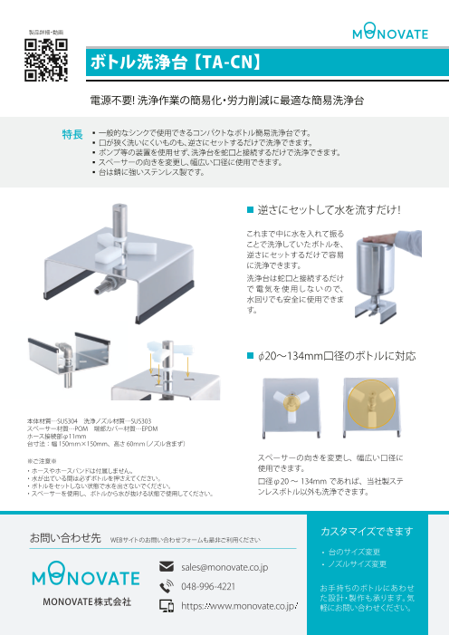 ○ポンプ等の装置を使用せず、洗浄台を蛇口と接続するだけで洗浄できます。 ○ボトル洗浄作業の簡易化・労力削減に最適です。 ○電気を使用しないので、水回りでも安全に使用できます。 ○スペーサーの向きを変更し、幅広い口径に使用できます。 ○口径φ20~...