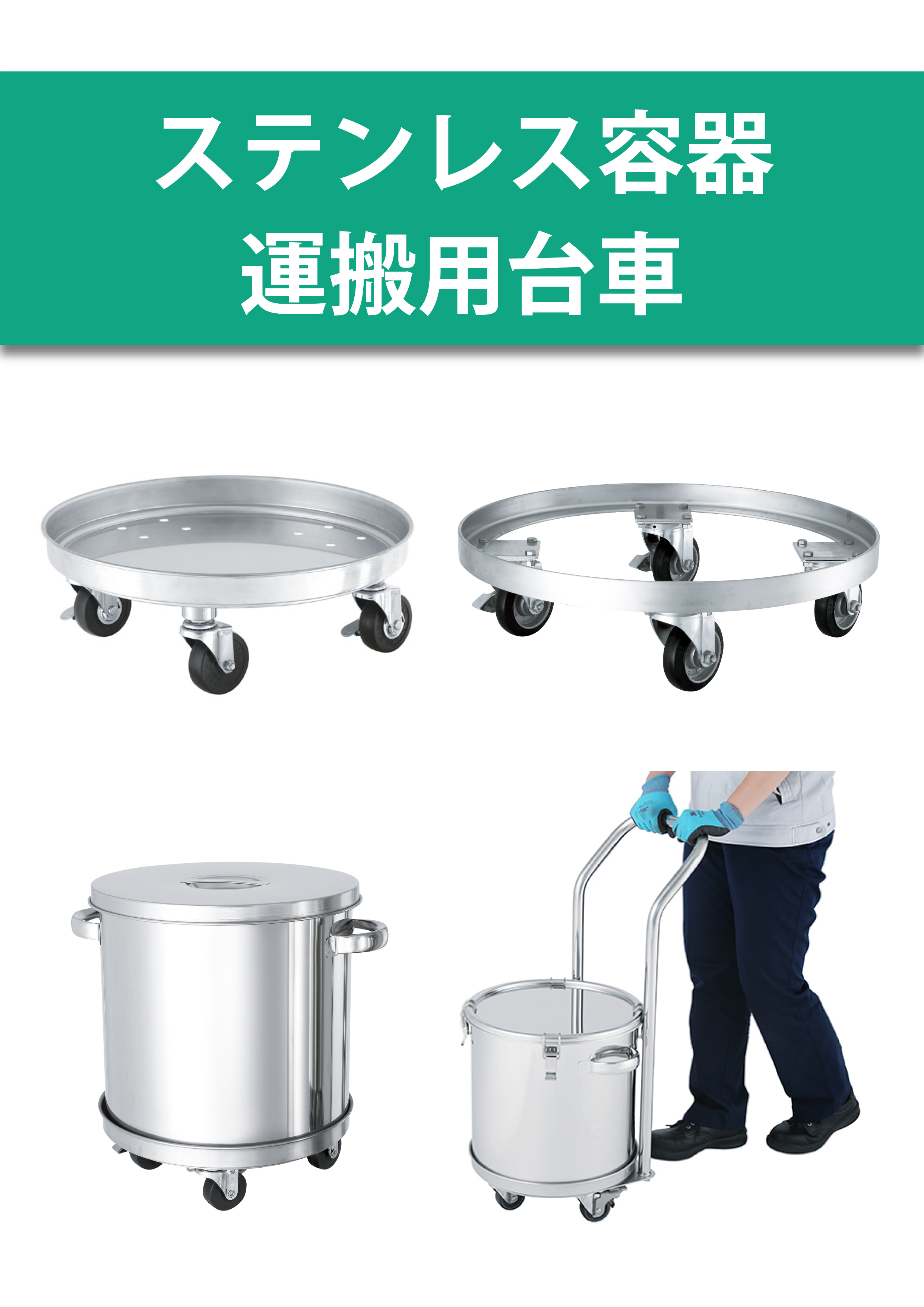 弊社製丸型ステンレス容器の移動に欠かせない台車をそろえました