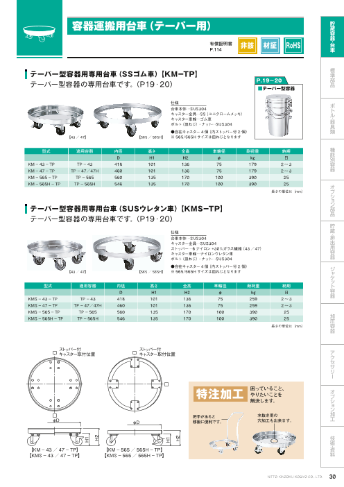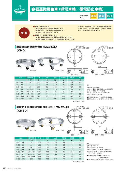 ○運搬用台車(SSゴム車)【KM】 ○運搬用台車(SUSウレタン車)【KMS】 ○導電車輪付運搬用台車(SSゴム車)【KMD】 ○帯電防止車輪付運搬用台車(SUSウレタン車)【KMSD】 ○テーパー型容器用専用台車(SSゴム車)【...