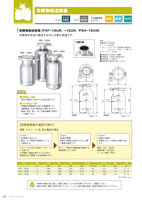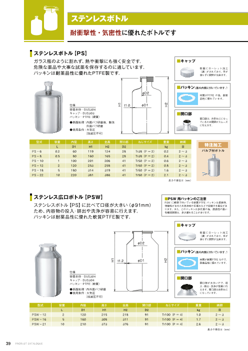 ステンレスボトル【PS】に比べて口径が大きい(φ91mm)ため、内容物の投入・排出や洗浄が容易に行えます。 パッキンは耐薬品性に優れた軟質PTFE製です。