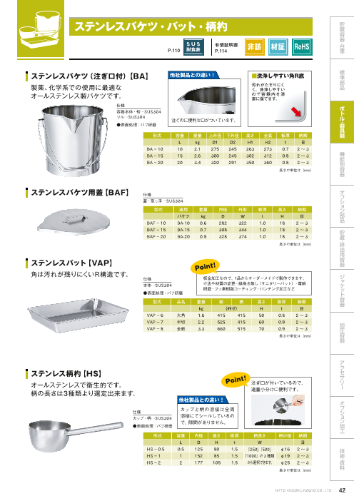 製薬、化学系での使用に最適なオールステンレスバケツです。 注ぎ口が付いているので、注いだり投入したりする際に便利です。