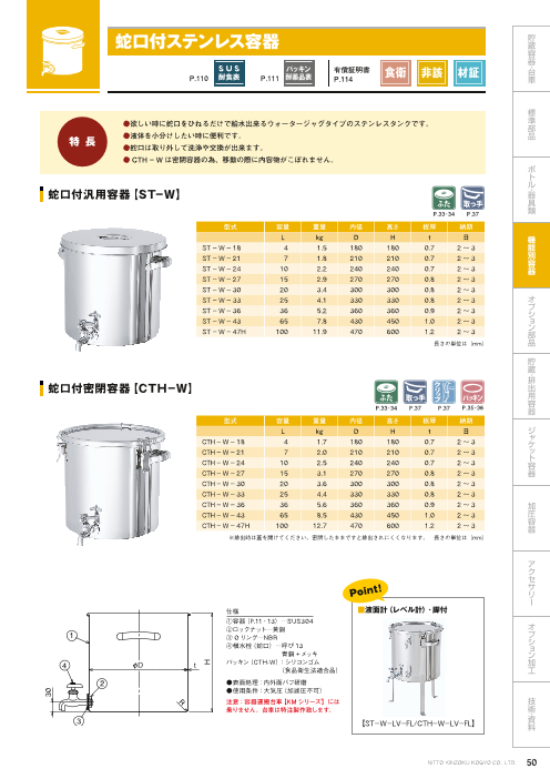 ○欲しい時に蛇口をひねるだけで給水出来るウォータージャグタイプのステンレスタンクです。 ○液体を小分けしたい時に便利です。 ○蛇口は取り外して洗浄や交換が出来ます。 ○CTH-Wは密閉容器の為、移動の際に内容物がこぼれません。 ※排出時は蓋を...
