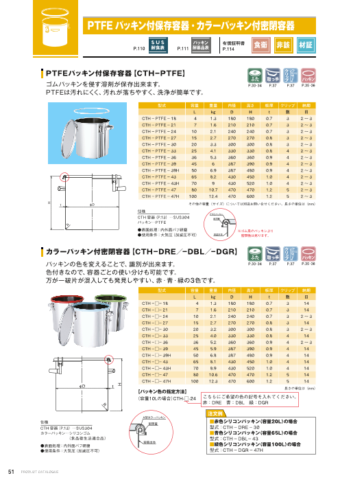 色別管理、異物混入対策に適したカラーパッキン仕様のステンレス容器