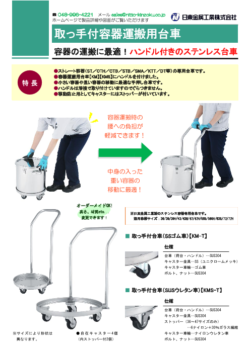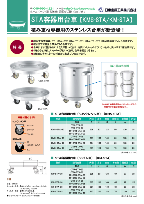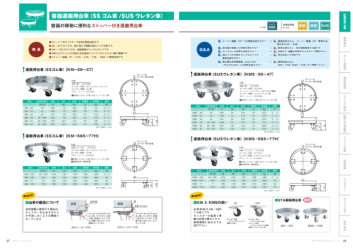 ○ストッパー付キャスターで台車を固定出来ます。 ○30~47 のサイズは、絞り加工で軽量な皿タイプの台車です。 ○565~77H のサイズは、強度重視のアングルタイプです。 ○SS製の金具とスタンダードなゴム製の車輪です。 ○ストレート容器(ST...