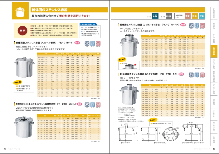 ストレートな短管タイプ。 配管の挿入やホース接続など様々な使い方が可能です。 ○粉砕機・ふるい機・サイクロンや集塵機等の設備での粉粒体の回収に活躍します。 ○ステンレス蓋とステンレス容器がワンタッチで取り外しできるキャッチクリップ式です。 ...