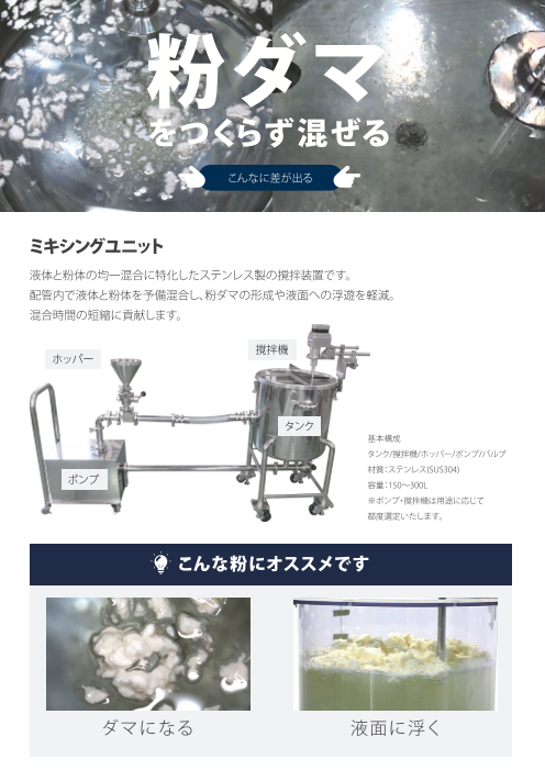 ・ヒーターユニットは容器に直接ヒーターが取り付けてあるため設備がコンパクトで場所をとりません。 ・撹拌機を容器に取り付けでき、内容液を均一に昇温できます。 ・機器がすべて容器に付いているので移動が簡単です。 ◆詳細はカタログをダウンロードしご覧...