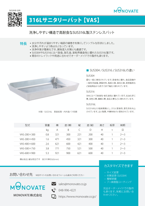 洗浄時間の短縮や異物混入対策に最適なステンレスバット 高耐食のSUS316L製です。 ○水分や汚れが溜まりやすい端部の縁巻きを無くしてシンプルな形状にしました。 ○洗浄しやすいよう角は丸くなっています。 ○洗浄作業が簡素化でき、異物混入対策...