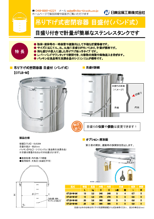 バンドの開閉をロックして、無断使用や誤開封を防げる密閉容器です。 ○施錠のできるステンレス容器です。 ○鍵をかけることで第三者の接触防止、無断使用の防止になります。 また、移動時の衝撃によるレバーバンドの脱落防止になります。
