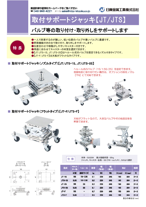 ○一人で脱着するのが難しい、低い位置のバルブや重いバルブに最適です。 ○昇降機能付きの台で取り付け、取り外しをサポートします。 ○位置合わせや移動がしやすいキャスター付きです。 ○用途に合わせてキャスターの材質を選択できます。 ○【JT/JTS-...