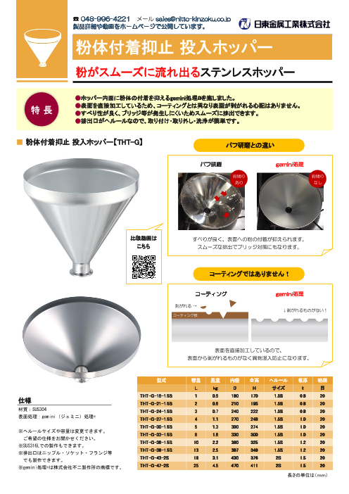 ○充填機や大型容器への投入用に最適です。 ○ホッパー内面に粉体の付着を抑えるgemini処理®を施しました。 ○表面を直接加工しているため、コーティングとは異なり表面が剥がれる心配はありません。 ○すべり性が良く、ブリッジ等が発生しにくいためスム...