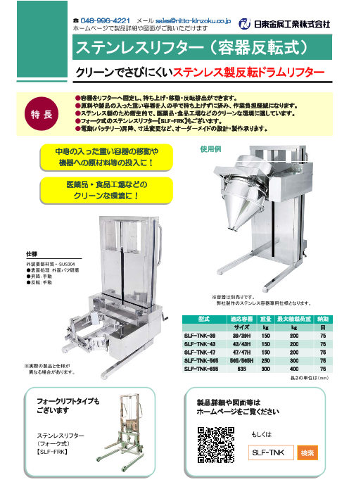 ○容器をリフターへ固定し、持ち上げ、移動、反転排出ができます。 ○原料や製品の入った重い容器を人の手で持ち上げずに済み、作業負担軽減になります。 ○ステンレス製のため衛生的で、医薬品、食品工場などクリーンな環境に適しています。 ○フォーク式のステン...