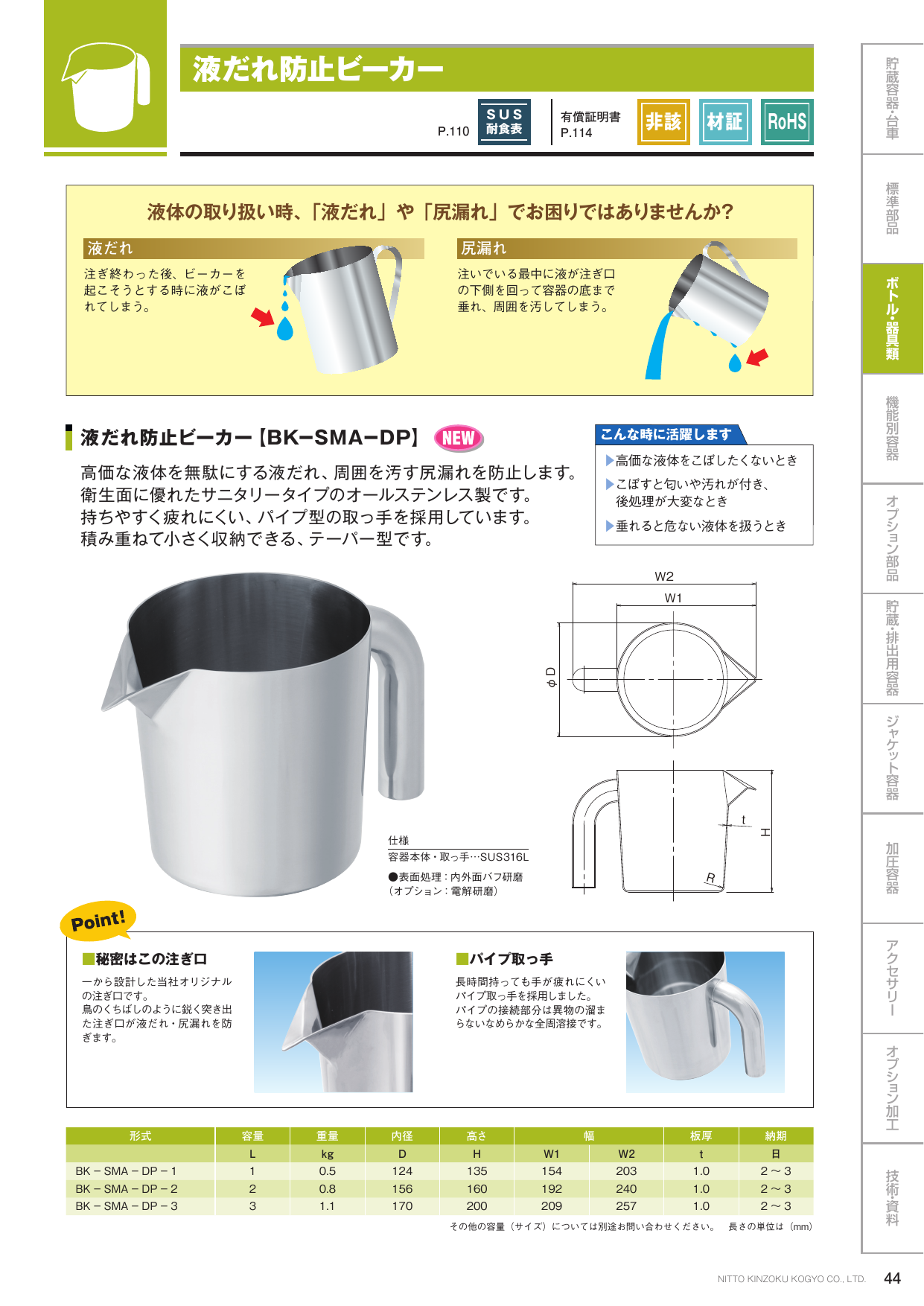 ○ステンレスビーカー【BK】 オールステンレス製の為、製薬や化学系での使用に最適です。 実験や生産ラインにて多く使用されております。 大きな注ぎ口が付いているので、内容物をあけるのに便利です。 ○サニタリービーカー【BK-SMA】 全て全周...