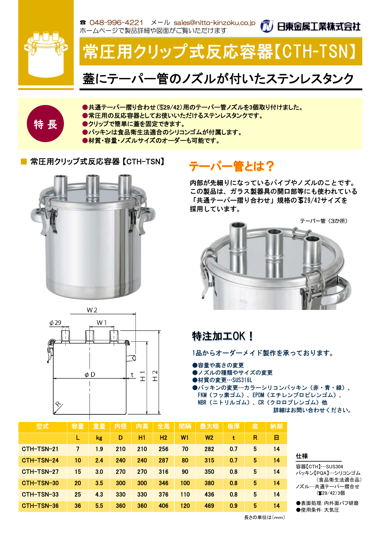 【特長】 ●共通テーパー摺り合わせ( 29/42)用のテーパー管ノズルを3個取り付けました。 ●常圧用の反応容器としてお使いいただけるステンレスタンクです。 ●クリップで簡単に蓋を固定できます。 ●パッキンは食品衛生法適合のシリコンゴム...