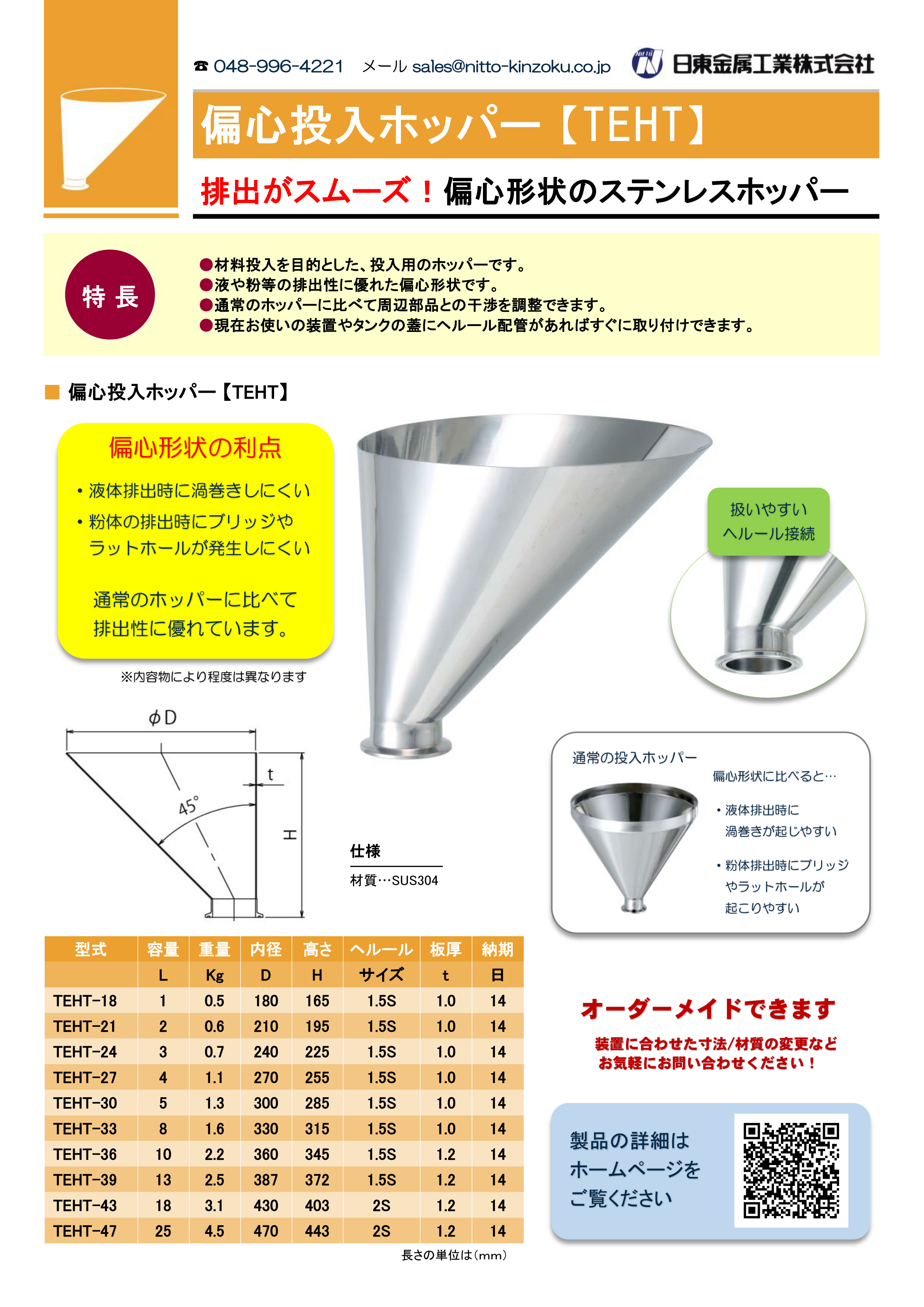 ○材料投入を目的とした、投入用のホッパーです。 ○液や粉等の排出性に優れた偏心形状です。 ○通常のホッパーに比べて周辺部品との干渉を調整できます。 ○現在お使いの装置やタンクの蓋にヘルール配管があればすぐに取り付けできます