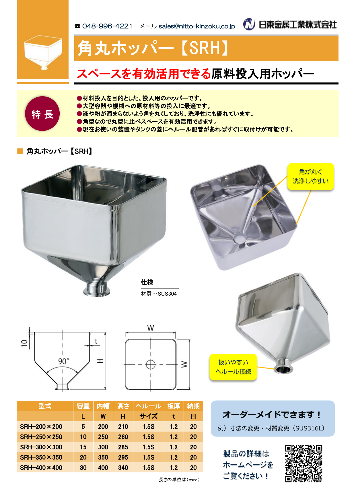 特長 ●材料投入を目的とした、投入用のホッパーです。 ●大型容器や機械への原材料等の投入に最適です。 ●液や粉が溜まらないよう角を丸くしており、洗浄性にも優れています。 ●角型なので丸型に比べスペースを有効活用できます。 ●現在お使いの装置やタ...