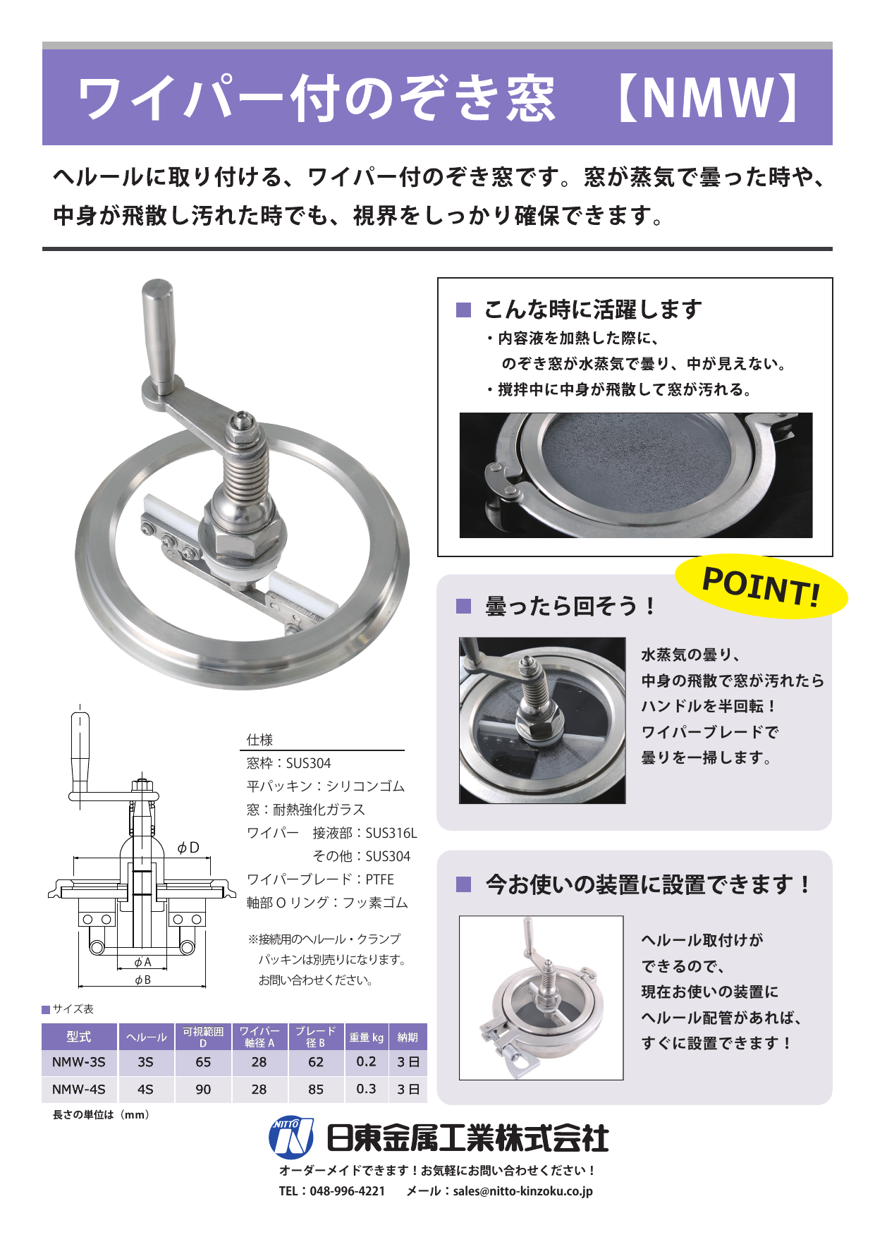 窓が蒸気で曇った時や、中身が飛散し汚れた時でも、視界をしっかり確保できます。 ■こんな時に活躍します ・内容液を加熱した際に、のぞき窓が水蒸気で曇り、中が見えない。 ・撹拌中に中身が飛散して窓が汚れる。