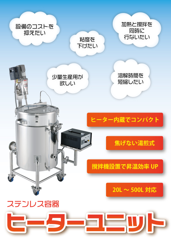 このPDF資料では、ヒーターユニットの特長と今までの採用実績の一部をご紹介しています。 【ヒーターユニットの特長】 ○ヒーターがタンクジャケット部に取り付けてあり、これ1台で液体を温めることができます。 ○空焚き防止機能が付いているので、ジャ...