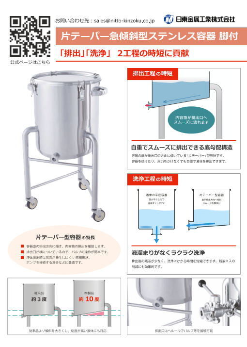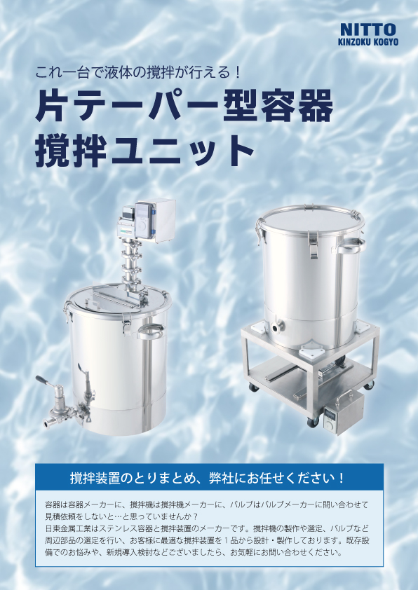 |片テーパー型容器とは 片テーパー型容器は、底板を斜めに取り付けたステンレスタンクです。 通常のステンレスタンクに比べて内容液の排出性に優れており、ロスを減らすことができます。 |片テーパー型ステンレス容器 撹拌ユニット【KU】 空気の巻き込...