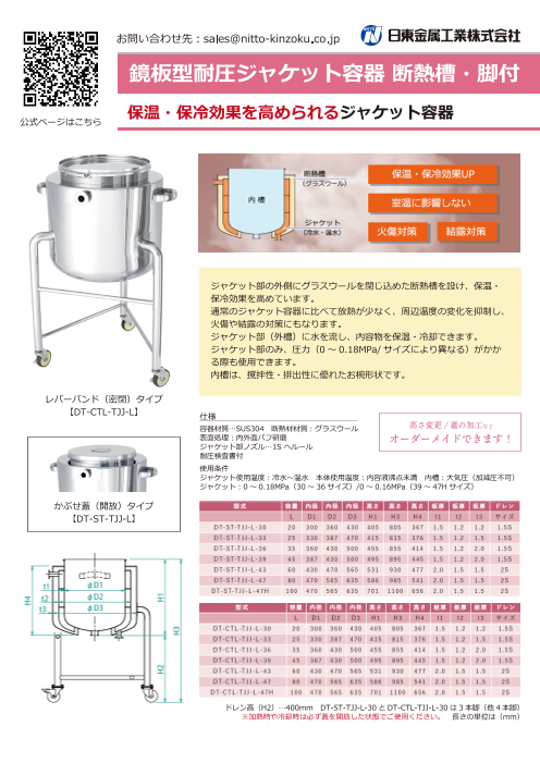鏡板型耐圧ジャケット容器 断熱槽・脚付【DT-TJJ-L】は通常のジャケット容器とは異なり、ジャケット部の外側にグラスウールを閉じ込めた断熱槽を設けています。 そのため、断熱槽のない通常のジャケット容器に比べて ・内容液の保温や保冷の効率がアップ...
