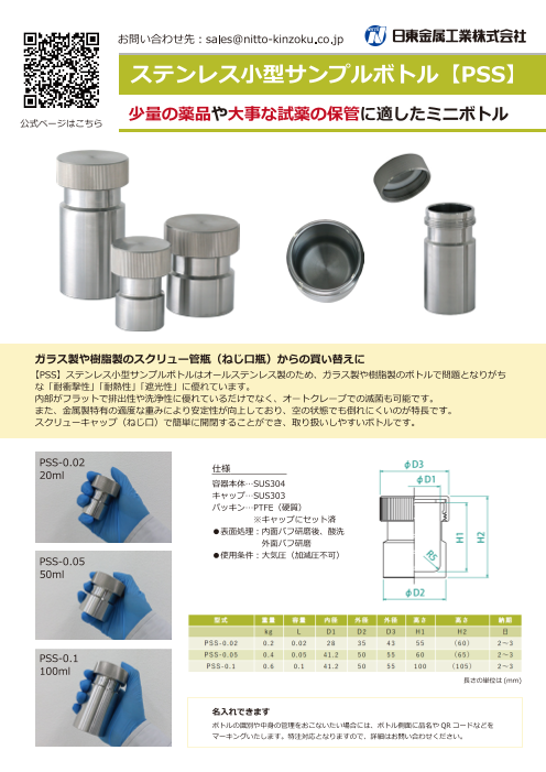このサンプルボトルはオールステンレス製のため、ガラス製や樹脂製のボトルで問題となりがちな「耐衝撃性」「耐熱性」「遮光性」に優れています。 内部がフラットで排出性や洗浄性に優れているだけでなく、オートクレーブでの滅菌も可能です。 また、金属製特有の適度...