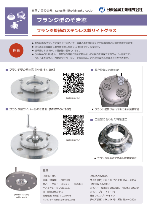 ○既存設備のフランジに取り付けることで、容器の蓋を開けなくても容器内部の状態を確認できます。 ○のぞき窓を容器から取り外す際にもガラスは脱落せず、安全です。 ○接液部はSUS316Lで耐食性に優れています。 ○窓部には衝撃に強い耐熱強化ガラスを使用...