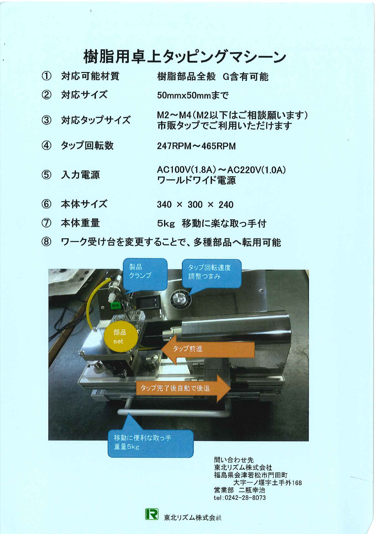 1.対応可能材質:樹脂部品全般 G含有可能 2.対応サイズ:50mm×50mmまで 3.対応タップサイズ:M2~M4 4.タップ回転数:247RPM~465RPM 5.入力電源:AC100V(1.8A)~AC220V(1.0A) ワールドワイド電...