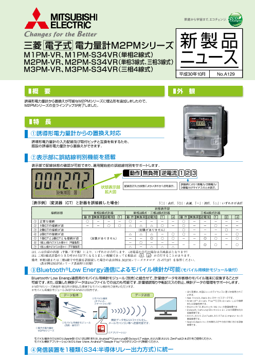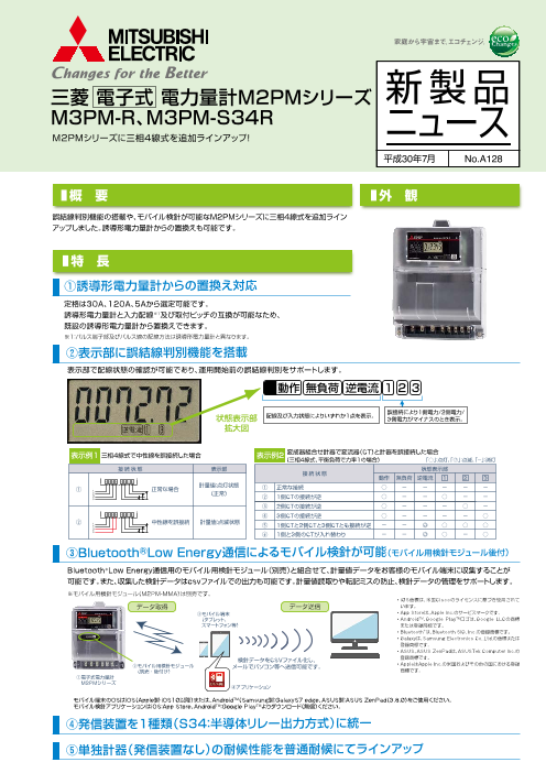 【特徴】◆誘導形電力量計からの置換え対応◆表示部に誤結線判別機能を搭載◆Bluetooth(R)Low Energy 通信によるモバイル検針が可能 ◆発信装置を1種類に(S34:半導体リレー...